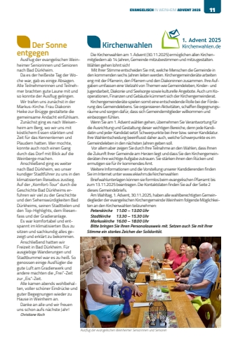 EVANGELISCH IN WEINHEIM ADVENT 2025 11Ausflug der evangelischen Weinheimer Seniorinnen und SeniorenDer Sonne entgegenAusflug der evangelischen Weinheimer Seniorinnen und Senioren nach Bad D%u00fcrkheim.Da es der hei%u00dfeste Tag der Woche war, gab es einige Absagen. Alle Teilnehmerinnen und Teilnehmer brachten gute Laune mit und so konnte der Ausflug gelingen. Wir trafen uns zun%u00e4chst in der Markus-Kirche. Frau Diakonin Heike zur Br%u00fcgge gestaltete die gemeinsame Andacht einf%u00fchlsam. Zun%u00e4chst ging es nach Weisenheim am Berg, wo wir uns mit k%u00f6stlichem Essen st%u00e4rkten und Zeit f%u00fcr das Kennenlernen und Plaudern hatten. Wer mochte, konnte auch noch einen Gang durch das Dorf mit Blick auf die Weinberge machen. Anschlie%u00dfend ging es weiter nach Bad D%u00fcrkheim, wo unser kundiger Stadtf%u00fchrer zu uns in den klimatisierten Reisebus zustieg. Auf der %u201eKomfort-Tour%u201c durch die Geschichte Bad D%u00fcrkheims erfuhren wir viel zu der Geschichte und den Sehensw%u00fcrdigkeiten Bad D%u00fcrkheims, seinen Stadtteilen und den Top-Highlights, dem Riesenfass und der Gradieranlage. Es war komfortabel und entspannt im klimatisierten Bus zu sitzen und sachkundig alles gezeigt und erkl%u00e4rt zu bekommen. Anschlie%u00dfend hatten wir Freizeit in Bad D%u00fcrkheim. F%u00fcr ausgiebige Wanderungen und Stadtbummel war es zu hei%u00df. So genossen einige Ausfl%u00fcgler die gute Luft am Gradierwerk und andere machten die %u201eFrei%u201c-Zeit zur %u201eEis%u201c-Zeit. Alle kamen abends wohlbehalten, voller sch%u00f6ner Eindr%u00fccke und guter Begegnungen wieder zu Hause in Weinheim an. Danke an alle und wir freuen uns schon aufs n%u00e4chste Jahr! Christiane KochKirchenwahlenDie Kirchenwahlen am 1. Advent (30.11.2025) erm%u00f6glichen allen Kirchenmitgliedern ab 14 Jahren, Gemeinde mitzubestimmen und mitzugestalten. W%u00e4hlen gehen lohnt sich! Mit Ihrer Stimme entscheiden Sie mit, welche Menschen die Gemeinde in den kommenden sechs Jahren leiten werden. Kirchengemeinder%u00e4te arbeiten eng mit der Pfarrerin, den Pfarrern und den Diakoninnen zusammen. Ihre Aufgaben umfassen eine Vielzahl von Themen wie Gemeindeleben, Kinder- und Jugendarbeit, Diakonie und Seelsorge sowie kulturelle Angebote. Auch um Kooperationen, Finanzen und Geb%u00e4ude k%u00fcmmert sich der Kirchengemeinderat. Kirchengemeinder%u00e4te spielen somit eine entscheidende Rolle bei der F%u00f6rderung des Gemeindelebens. Sie organisieren Aktivit%u00e4ten, schaffen Begegnungsr%u00e4ume und sorgen daf%u00fcr, dass sich Gemeindemitglieder willkommen und einbezogen f%u00fchlen. Wenn Sie am 1. Advent w%u00e4hlen gehen, %u00fcbernehmen Sie Verantwortung f%u00fcr die Ausrichtung und Gestaltung dieser wichtigen Bereiche, denn jede Kandidatin und jeder Kandidat setzt Schwerpunkte bei ihrer bzw. seiner Kandidatur. Ihre Wahlentscheidung beeinflusst daher auch, welche Schwerpunkte es im Gemeindeleben in den n%u00e4chsten Jahren geben soll. Vor allem aber zeigen Sie durch Ihre Teilnahme an den Wahlen, dass Ihnen die Zukunft Ihrer Gemeinde am Herzen liegt und dass Sie den Kirchengemeinder%u00e4ten ihre wichtige Aufgabe zutrauen. Sie st%u00e4rken ihnen den R%u00fccken und ermutigen sie f%u00fcr ihr kommendes Amt. Weitere Informationen und die Vorstellung unserer Kandidierenden finden Sie im Internet unter www.ekiwhm.de/kirchenwahlenBriefwahlunterlagen k%u00f6nnen sie formlos beim evangelischen Pfarramt bis zum 13.11.2025 beantragen. Die Kontaktdaten finden Sie auf der Seite 2 dieses Gemeindebriefs.Am Wahltag, 1. Advent, 30.11.2025, haben alle wahlberechtigten Gemeindeglieder der evangelischen Kirchengemeinde Weinheim folgende M%u00f6glichkeiten an den Kirchenwahlen teilzunehmen:Peterskirche 11.00 %u2013 13.00 UhrStadtkirche 13.30 %u2013 15.30 UhrMarkuskirche 16.00 %u2013 18.00 UhrBitte bringen Sie Ihren Personalausweis mit. Setzen auch Sie mit Ihrer Stimme ein starkes Zeichen der Solidarit%u00e4t.