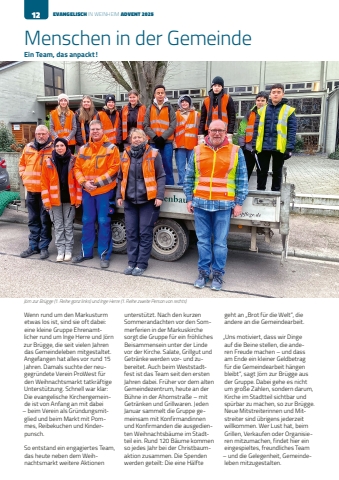 12 EVANGELISCH IN WEINHEIM ADVENT 2025Menschen in der GemeindeEin Team, das anpackt!Wenn rund um den Markusturm etwas los ist, sind sie oft dabei: eine kleine Gruppe Ehrenamtlicher rund um Inge Herre und J%u00f6rn zur Br%u00fcgge, die seit vielen Jahren das Gemeindeleben mitgestaltet. Angefangen hat alles vor rund 15 Jahren. Damals suchte der neugegr%u00fcndete Verein ProWest f%u00fcr den Weihnachtsmarkt tatkr%u00e4ftige Unterst%u00fctzung. Schnell war klar: Die evangelische Kirchengemeinde ist von Anfang an mit dabei %u2013 beim Verein als Gr%u00fcndungsmitglied und beim Markt mit Pommes, Reibekuchen und Kinderpunsch.So entstand ein engagiertes Team, das heute neben dem Weihnachtsmarkt weitere Aktionen unterst%u00fctzt. Nach den kurzen Sommerandachten vor den Sommerferien in der Markuskirche sorgt die Gruppe f%u00fcr ein fr%u00f6hliches Beisammensein unter der Linde vor der Kirche. Salate, Grillgut und Getr%u00e4nke werden vor- und zubereitet. Auch beim Weststadtfest ist das Team seit den ersten Jahren dabei. Fr%u00fcher vor dem alten Gemeindezentrum, heute an der B%u00fchne in der Ahornstra%u00dfe %u2013 mit Getr%u00e4nken und Grillwaren. Jeden Januar sammelt die Gruppe gemeinsam mit Konfirmandinnen und Konfirmanden die ausgedienten Weihnachtsb%u00e4ume im Stadtteil ein. Rund 120 B%u00e4ume kommen so jedes Jahr bei der Christbaumaktion zusammen. Die Spenden werden geteilt: Die eine H%u00e4lfte geht an %u201eBrot f%u00fcr die Welt%u201c, die andere an die Gemeindearbeit.%u201eUns motiviert, dass wir Dinge auf die Beine stellen, die anderen Freude machen %u2013 und dass am Ende ein kleiner Geldbetrag f%u00fcr die Gemeindearbeit h%u00e4ngen bleibt%u201c, sagt J%u00f6rn zur Br%u00fcgge aus der Gruppe. Dabei gehe es nicht um gro%u00dfe Zahlen, sondern darum, Kirche im Stadtteil sichtbar und sp%u00fcrbar zu machen, so zur Br%u00fcgge. Neue Mitstreiterinnen und Mitstreiter sind %u00fcbrigens jederzeit willkommen. Wer Lust hat, beim Grillen, Verkaufen oder Organisieren mitzumachen, findet hier ein eingespieltes, freundliches Team %u2013 und die Gelegenheit, Gemeindeleben mitzugestalten.J%u00f6rn zur Br%u00fcgge (1. Reihe ganz links) und Inge Herre (1. Reihe zweite Person von rechts)