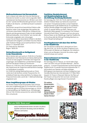 EVANGELISCH IN WEINHEIM ADVENT 2025 17Freiburger Stra%u00dfe 19 %u2013 21 %u2022 www.pflanzenparadies-weinheim.deBei uns bl%u00fcht Ihnen was!Unser Familienbetrieb bietet seit %u00fcber 50 Jahren Qualit%u00e4t und beste Beratung rund um Blumen, Pflanzen und Garten. Pflanzenparadies Pflanzenpar Weinheim adies WeinheimF%u00fcr weitere Konzertank%u00fcndigungen lesen Sie bitte den digitalenKonzertkalender%u201eMusik in Weinheimer Kirchen%u201cWeihnachtskonzert bei KerzenscheinAuch in diesem Jahr laden die Ch%u00f6re der Weinheimer Peterskirche herzlich zu einem stimmungsvollen Weihnachtskonzert bei Kerzenschein ein. Mit dem Lied %u201eTochter Zion%u201c werden die Mitwirkenden gemeinsam mit dem Publikum die Advents- und Weihnachtszeit musikalisch einl%u00e4uten.Das Konzert verspricht ein besinnliches Erlebnis voller festlicher Lieder in der einzigartigen Atmosph%u00e4re der mit Kerzen erleuchteten Peterskirche. H%u00f6hepunkt des Abends wird das gemeinsame Finale mit dem beliebten Weihnachtsklassiker %u201eO du fr%u00f6hliche%u201c sein, bei dem alle Zuh%u00f6renden eingeladen sind, mitzusingen.Lassen Sie sich diesen besonderen Auftakt in die Weihnachtszeit nicht entgehen und erleben Sie einen Abend voller festlicher Kl%u00e4nge und vorweihnachtlicher Freude.Datum: 21. Dezember 2025Ort: Peterskirche, WeinheimBeginn: 18:00 UhrGottesdienstmusik an Heiligabendin der PeterskircheWie im letzten Jahr auch wird um 15:30 Uhr im Familiengottesdienst in der Peterskirche ein kleines Weihnachtsmusical von den j%u00fcngsten Chorkindern der Singschule vorgetragen. Die Goldkehlchen und Wichtelchors%u00e4nger kommen bei diesem Anlass auf Hochtouren.Ebenso um 17:00 Uhr in der Christvesper werden Kinder des Hauptchores der Singschule weihnachtliche Ges%u00e4nge im Gottesdienst musizieren. Um 23:00 Uhr erklingt Weihnachtsmusik zur Christmette durch die Kantorei und den Posaunenchor. Anschlie%u00dfend findet das mittern%u00e4chtliche Turmblasen des Posaunenchores statt, womit der 1. Weihnachtsfeiertag eingel%u00e4utet wird.Neue Jungbl%u00e4sergruppe ab OktoberAb Oktober bietet Posaunenchorleiter Felix Sch%u00fctze eine neue Jungbl%u00e4sergruppe f%u00fcr Grundsch%u00fcler und Vorschulkinder (gerne mit Eltern) donnerstags um 18 Uhr im Gemeindehaus der Stadtkirche an. Anmeldungen bitte an Felix Sch%u00fctze: posaunenchor-peterskirche@felix-schuetze.deFestliches Neujahrskonzertmit Neujahrsempfang durchdie Stiftung Chorklang WeinheimAm Samstag, den 10.01.26, 19 Uhr, l%u00e4dt Kirchenmusikdirektor Christian Raiser aus Karlsruhe zusammen mit seinem Trompetenensemble zu einem festlichen Neujahrskonzert in die Stadtkirche ein. Er und Bezirkskantorin Noreiks pflegen eine enge Konzert-Freundschaft. Es werden Werke von Bach, Telemann und Manfredini Widor gespielt. Es musizieren Prof. Eckhard Schmidt & Rudi Scheck, Trompete und Corno da caccia, Markus Raiser an der Matz&Luge-Orgel der Stadtkirche.Im Anschluss l%u00e4dt die Stiftung Chorklang Weinheim zu einem Neujahrsempfang ein!Faschingskonzert mit dem Chor 60 Plusin der StadtkircheDer Chor 60 Plus er%u00f6ffnet die 5. Jahreszeit am Sonntag, den 01.02., um 19 Uhr mit einem Programm zum Schmunzeln mit Werken von Ringelnatz, von Volkst%u00fcmlichem und von Banalem. Kommen Sie vorbei, es gibt sicherlich etwas zum Lachen! Emporenkonzert am Samstagin der StadtkircheAm Samstag, den 07. Februar, um 19 Uhr laden Organistin Lea Suter und Juan Gonzalez Martinez %u2013 Barockposaune %u2013 zu einem Emporenkonzert auf die Empore der Stadtkirche ein. Es werden Kammermusikwerke des 17. Jahrhunderts aus Spanien und Italien erklingen.2025 gewann sie zusammen mit ihrem Duopartner Juan Gonzalez Martinez den internationalen H.I.F. Biber Wettbewerb, St. Florian in %u00d6sterreich Nehmen Sie Platz auf der Empore und lauschen Sie! Lea Suter und Kantorin Noreiks pflegen eine enge Konzert-Freundschaft.