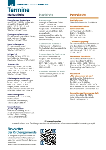 22 EVANGELISCH IN WEINHEIM ADVENT 2025Kunterbuntes Kinderchaosvon 15.30-17.00 Uhr im Gemeindesaal (f%u00fcr Kinder ab 5 J.): 08.11. / 13.12./ 10.1. / 14.2.Diak. Heike zur Br%u00fcgge,Telefon 0176/42051111KindergottesdienstteamEinmal monatlich nach VereinbarungDiak. Heike zur Br%u00fcgge,Telefon 0176/42051111BesuchsdienstkreisEinmal monatlich nachVereinbarung, Helmut Waas,Telefon 0177/2165065Bridge ClubMontag, 14.30 %u2013 17.00 Uhr,bei Elke Pauler, Erlenweg 1Elke Pauler, Telefon 06201/64287Seniorenclubdienstags 15.00 %u2013 16.30 Uhr: 11.11. / 25.11. (mit Peki) / 9.12. / 23.12. / 13.1. / 27.1. / 10.2. / 24.2. , Diak. Heike zur Br%u00fcgge,Telefon 0176/42051111Friedensgebet am Morgenjeweils freitags, vierzehnt%u00e4glich07.11. / 21.11. / 05.12. / 19.12. / 09.1. / 23.1. / 06.2. / 20.2.Beginn jeweils 08:00 Uhr,Markuskirche, Christl Daum und Marianne Riedle, 06201/53962MeditationsgruppeMittwoch, 8.30 %u2013 10.00 Uhr,MarkuskircheUrsula und Albert Meyer,Telefon 06201/65879Gespr%u00e4chskreis%u201eKaum zu glauben%u201cMonatlich, Dienstag, 19.30 %u2013 21.00 Uhr, kleiner Gemeindesaal, Pfarrer Detlev Schilling,Telefon 0176/34513783Markuskirche StadtkircheKrabbelgruppeMontags (au%u00dfer in den Ferien)10.00 - 11:30 Uhr imGemeindehaus an der Stadtkirche, Hauptstra%u00dfe 127. Bei Interesse wenden Sie sich bitte an Diak. Monika Prei%u00df,monika.preiss@kbz.ekiba.de(In den Ferien finden keine Gruppentreffen statt.)Malzirkel I und Malzirkel IIfinden jeweils 14-t%u00e4glich im Wechsel statt. Bei Interesse bitte im Pfarramt melden. Frauenkreis an der StadtkircheIm Caf%u00e9 im GemeindehausHauptstr. 127, donnerstagsimmer 15 Uhr, 06.11. / 20.11. / 04.12. / 18.12. / 08.01. / 22.01. / 05.02. / 26.02. / 12.03. / 26.03.Monatliche Aktionen f%u00fcr KinderTermine werden jeweils auf der Homepage eingestellt.TerminePeterskircheKrabbelgruppeSiehe Termine an der StadtkircheBesuchsdienstkreis ander Peterskircheim Pfarrhaus, Scheffelstr. 4Di 25.11. 18.30 UhrMo 26.01. 18.00 UhrDi 31.03. 18.30 Uhr%u201eCaf%u00e9 der Begegnung%u201cim Konfirmandensaal der Peterskirche, dienstags immer 14.30 Uhr,04.11. / 25.11. zu Gast im Seniorenclub Weststadt / 02.12. / 03.02. / 03.03. / 31.03.Frauenkreis Peterkircheim Pfarrhaus Scheffelstra%u00dfe 4,immer dienstags 15.00 Uhr,28.10. / 18.11. / 16.12. / 13.01. /27.01. / 10.02. / Do 26.02. zu Gast im Frauenkreis an der Stadtkirche /10.03. / 24.03.Frauentreff %u201eAlle wissen mehr als eine%u201c der Ort und die Zeit variieren:Mo 17.11. / Mo 15.12. / Do 22.01. um 19.30 Uhr /Mo 09.02. / Mo 16.03. / Mo 20.04.Bitte nehmen Sie bei Interesse Kontakt mit Diakonin Monika Prei%u00df auf.Internationales Begegnungs-Caf%u00e9immer dienstags, 16-18 Uhrin der Liebenzeller Gemeinde,N%u00f6rdliche Hauptstr. 51Newsletterder KirchengemeindeIn unregelm%u00e4%u00dfigen Abst%u00e4nden verschicken wir einen Newsletter per Mail. Hier k%u00f6nnen Sie sich daf%u00fcr an-/abmelden:https://www.ekiwhm.de/newsletter/KrippenspielprobenListe der Proben- bzw. Familiengottesdiensttermine sind abrufbar unter www.ekiwhm.de/krippenspiel