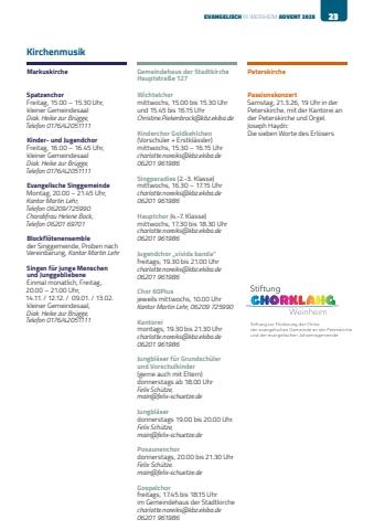 EVANGELISCH IN WEINHEIM ADVENT 2025 23KirchenmusikSpatzenchorFreitag, 15.00 %u2013 15.30 Uhr,kleiner GemeindesaalDiak. Heike zur Br%u00fcgge,Telefon 0176/42051111Kinder- und JugendchorFreitag, 16.00 %u2013 16.45 Uhr,kleiner GemeindesaalDiak. Heike zur Br%u00fcgge,Telefon 0176/42051111Evangelische SinggemeindeMontag, 20.00 %u2013 21.45 Uhr,Kantor Martin Lehr,Telefon 06209/725990Chorobfrau Helene Bock,Telefon 06201 69701Blockfl%u00f6tenensembleder Singgemeinde, Proben nach Vereinbarung, Kantor Martin LehrSingen f%u00fcr junge Menschenund JunggebliebeneEinmal monatlich, Freitag,20.00 %u2013 21.00 Uhr,14.11. / 12.12. / 09.01. / 13.02.kleiner Gemeindesaal,Diak. Heike zur Br%u00fcgge,Telefon 0176/42051111Wichtelchormittwochs, 15.00 bis 15.30 Uhr und 15.45 bis 16.15 UhrChristine.Piekenbrock@kbz.ekiba.deKinderchor Goldkehlchen(Vorsch%u00fcler + Erstkl%u00e4ssler)mittwochs, 15.30 %u2013 16.15 Uhr charlotte.noreiks@kbz.ekiba.de06201 961986Singparadies (2.-3. Klasse) mittwochs, 16.30 %u2013 17.15 Uhrcharlotte.noreiks@kbz.ekiba.de06201 961986Hauptchor (4.-7. Klasse)mittwochs, 17.30 bis 18.30 Uhr charlotte.noreiks@kbz.ekiba.de06201 961986Jugendchor %u201evivida banda%u201cfreitags, 19.30 bis 21.00 Uhrcharlotte.noreiks@kbz.ekiba.de06201 961986Chor 60Plus jeweils mittwochs, 10.00 UhrKantor Martin Lehr, 06209 725990Kantorei montags, 19.30 bis 21.30 Uhrcharlotte.noreiks@kbz.ekiba.de06201 961986Jungbl%u00e4ser f%u00fcr Grundsch%u00fclerund Vorschulkinder(gerne auch mit Eltern)donnerstags ab 18.00 UhrFelix Sch%u00fctze,main@felix-schuetze.deJungbl%u00e4serdonnerstags 19.00 bis 20.00 Uhr.Felix Sch%u00fctze,main@felix-schuetze.dePosaunenchor donnerstags, 20.00 bis 21.30 Uhr Felix Sch%u00fctze.main@felix-schuetze.deGospelchor freitags, 17.45 bis 18.15 Uhrim Gemeindehaus der Stadtkirchecharlotte.noreiks@kbz.ekiba.de06201 961986Gemeindehaus der StadtkircheHauptstra%u00dfe 127Markuskirche PeterskirchePassionskonzertSamstag, 21.3.26, 19 Uhr in der Peterskirche, mit der Kantorei an der Peterskirche und Orgel.Joseph Haydn:Die sieben Worte des Erl%u00f6sers