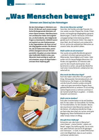 4 EVANGELISCH IN WEINHEIM ADVENT 2025Bei den Heimattagen in Weinheim vom 16. bis 18. Mai war auch unsere evangelische Kirchengemeinde Weinheim mit einem Stand vertreten. Viele Besucherinnen und Besucher haben dort angehalten, um f%u00fcnf einfache, aber tiefgehende Fragen zu beantworten. Vielleicht waren sie inspiriert von den Psalmenversen in den Segenskeksen, die ihnen mit auf den Weg gegeben wurden. Die Antworten, die wir bekommen haben, waren ehrlich, bewegend und zum Teil sehr pers%u00f6nlich. Sie geben uns einen kleinen, aber kraftvollen Einblick in das, was Menschen heute wichtig ist, wof%u00fcr sie sich einsetzen, wovor sie Angst haben %u2013 und was ihnen Hoffnung gibt.%u201eWas Menschen bewegt%u201cStimmen vom Stand auf den HeimattagenWas ist den Menschen wichtig?Ganz klar: die Familie und enge Freunde. Immer wieder wurden Ehepartner, Kinder, Enkelkinder und langj%u00e4hrige Wegbegleiter genannt. Beziehungen, in denen Vertrauen, Ehrlichkeit und gegenseitige Unterst%u00fctzung z%u00e4hlen %u2013 gerade auch in schweren Zeiten. Das zeigt: In einer Welt, die oft hektisch und un%u00fcbersichtlich ist, sind es die verl%u00e4sslichen Menschen an unserer Seite, die wirklich z%u00e4hlen.Wof%u00fcr wollen sie sich einsetzen?Hier wurde eine gro%u00dfe Bandbreite genannt %u2013 und doch mit einem gemeinsamen Kern: Miteinander, Gerechtigkeit und Frieden. Viele wollen sich f%u00fcr benachteiligte Menschen, f%u00fcr Kinder und Jugendliche, f%u00fcr Inklusion oder auch f%u00fcr die Umwelt starkmachen. Es ist ber%u00fchrend zu sehen, wie gro%u00df das Bed%u00fcrfnis nach einer menschlicheren, solidarischen Gesellschaft ist.Was macht den Menschen Angst?Auch das haben viele offen mit uns geteilt: Krieg, Klimawandel, Demokratieverlust und Extremismus. Die Sorgen um die Weltlage und die Zukunft unseres Landes sind gro%u00df %u2013 aber auch ganz pers%u00f6nliche %u00c4ngste, etwa geliebte Menschen zu verlieren. Es ist wichtig, solche %u00c4ngste ernst zu nehmen und ihnen in der Gemeinschaft Raum zu geben %u2013 in Gebet, Gespr%u00e4ch und Zuh%u00f6ren.Wof%u00fcr sind sie dankbar?Trotz aller Unsicherheiten ist da viel Dankbarkeit: f%u00fcr das Leben, f%u00fcr Gesundheit, f%u00fcr Familie, f%u00fcr Freundschaften, f%u00fcr den Glauben. Besonders ber%u00fchrend: Viele Menschen danken f%u00fcr die kleinen, oft selbstverst%u00e4ndlichen Dinge %u2013 ein Dach %u00fcber dem Kopf, ein Lachen, eine gute Begegnung. Diese Dankbarkeit ist wie ein stiller Schatz mitten im Alltag.Was gibt ihnen Hoffnung?Antworten wie %u201edas Gute im Menschen%u201c, %u201emein Glaube%u201c, %u201emeine Familie%u201c, %u201eGebet und Musik%u201c zeigen: Die Hoffnung lebt. Sie ist nicht laut, aber kraftvoll. Und sie ist oft getragen vom Vertrauen %u2013 in Gott, in andere Menschen und in die M%u00f6glichkeit, dass es auch anders und besser werden kann.